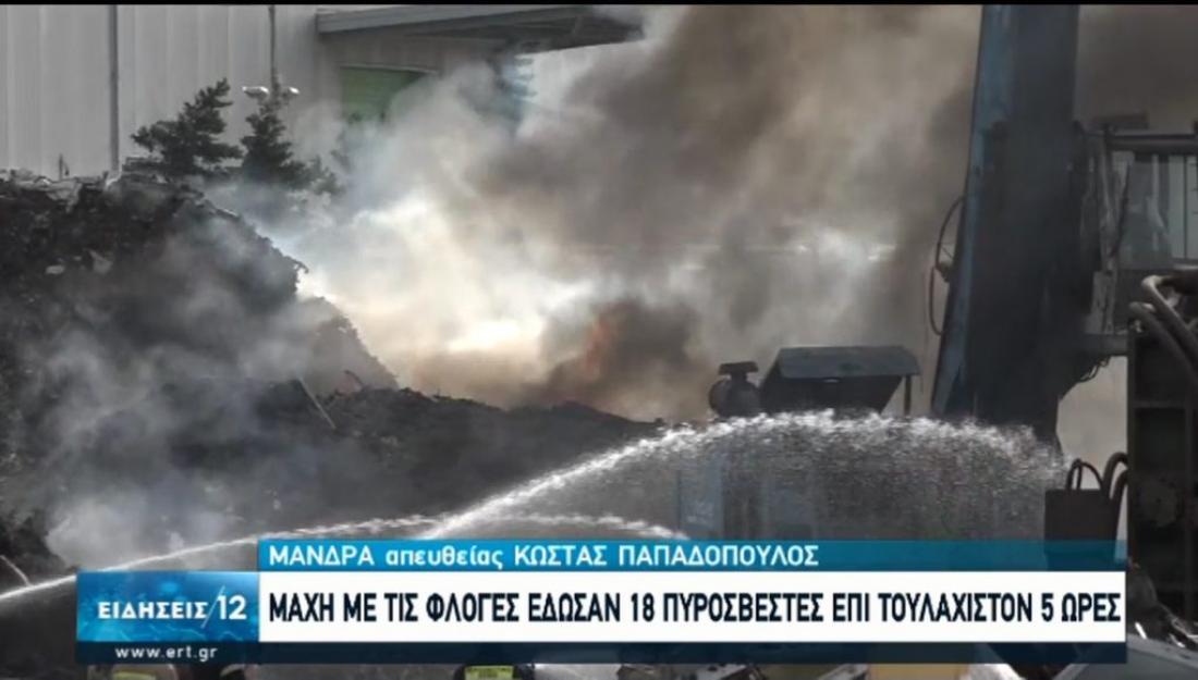 Υπό πλήρη έλεγχο τέθηκε η πυρκαγιά που ξέσπασε στις 5:30 τα ξημερώματα στον προαύλιο χώρο εργοστασίου ανακύκλωσης, στη Μάνδρα Αττικής. Η Πυροσβεστική χρειάστηκε τουλάχιστον πέντε ώρες για να καταφέρει να τη θέσει υπό έλεγχο, εξαιτίας των εύφλεκτων υλικών.