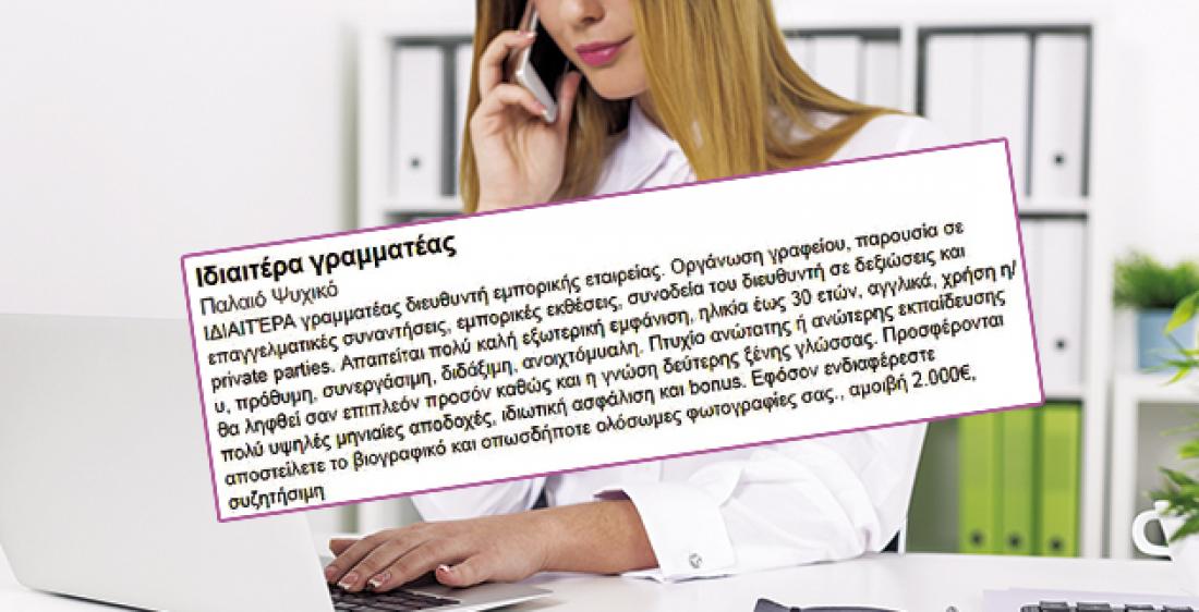Ο επίδοξος εργοδότης δείχνει ιδιαίτερα γαλαντόμος, αφού δίνει μισθό 2.000 ευρώ για τη γραμματέα, η οποία όμως πρέπει -πέρα από τα «ευπρόσδεκτα» τυπικά προσόντα- να είναι κάτω των 30, πολύ εμφανίσιμη και καλλίγραμμη, κάτι που θα αποδείξει με αρκετές ολόσωμες φωτογραφίες, τις οποίες θα επισυνάψει στο βιογραφικό της! Βέβαια, προκαλεί απορίες η απαίτησή του η υποψήφια να έχει την ευχέρεια να συμμετέχει σε prive party και δεξιώσεις συνοδεύοντας το αφεντικό και να είναι... γενικώς (;) συνεργάσιμη!