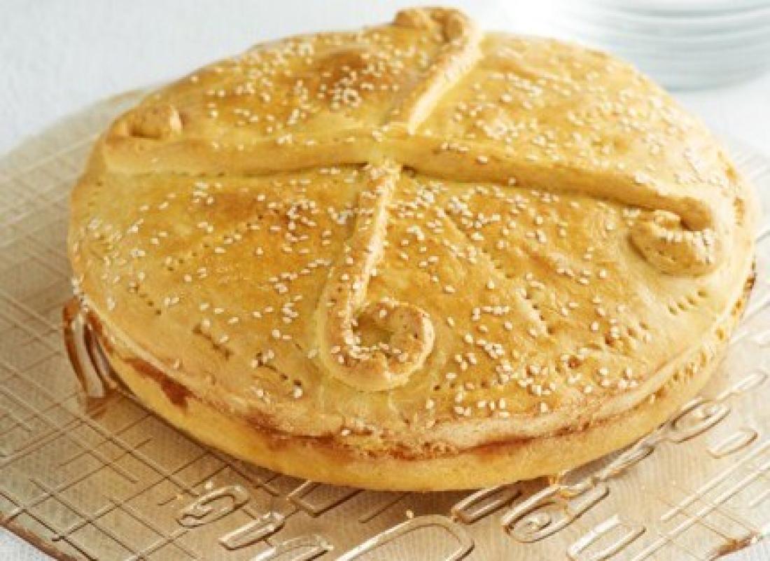 Αλείφετε την επιφάνεια με τον κρόκο αβγού και πασπαλίζετε με το σουσάμι. Ψήνετε την πίτα στους 180οC για 40 λεπτά και μετά στους 150οC για 15-20 λεπτά ακόμη, μέχρι να πάρει ένα ωραίο χρυσαφί χρώμα.