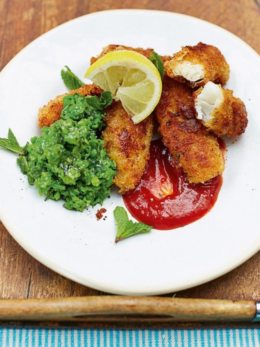 Τηγανίζετε τα ψάρια για 2-3 λεπτά κάθε πλευρά και στο μεταξύ έχετε πολτοποιήσει τον αρακά, στο οποίο προσθέτετε το χυμό λεμονιού και τον δυόσμο.