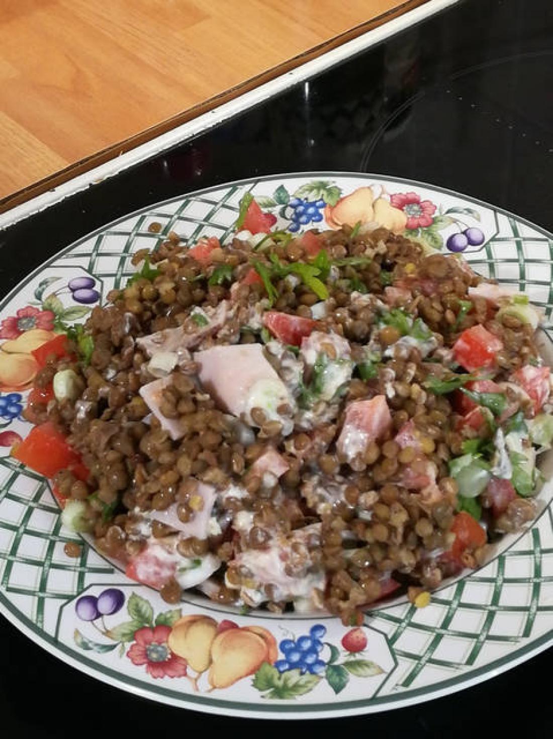 Ανακατεύετε σε μια απλωτή σαλατιέρα τις φακές με την ντομάτα, τα κρεμμυδάκια, την καπνιστή γαλοπούλα κομμένη σε μικρά κομμάτια και το μαϊντανό ψιλοκομμένο κι αυτό.