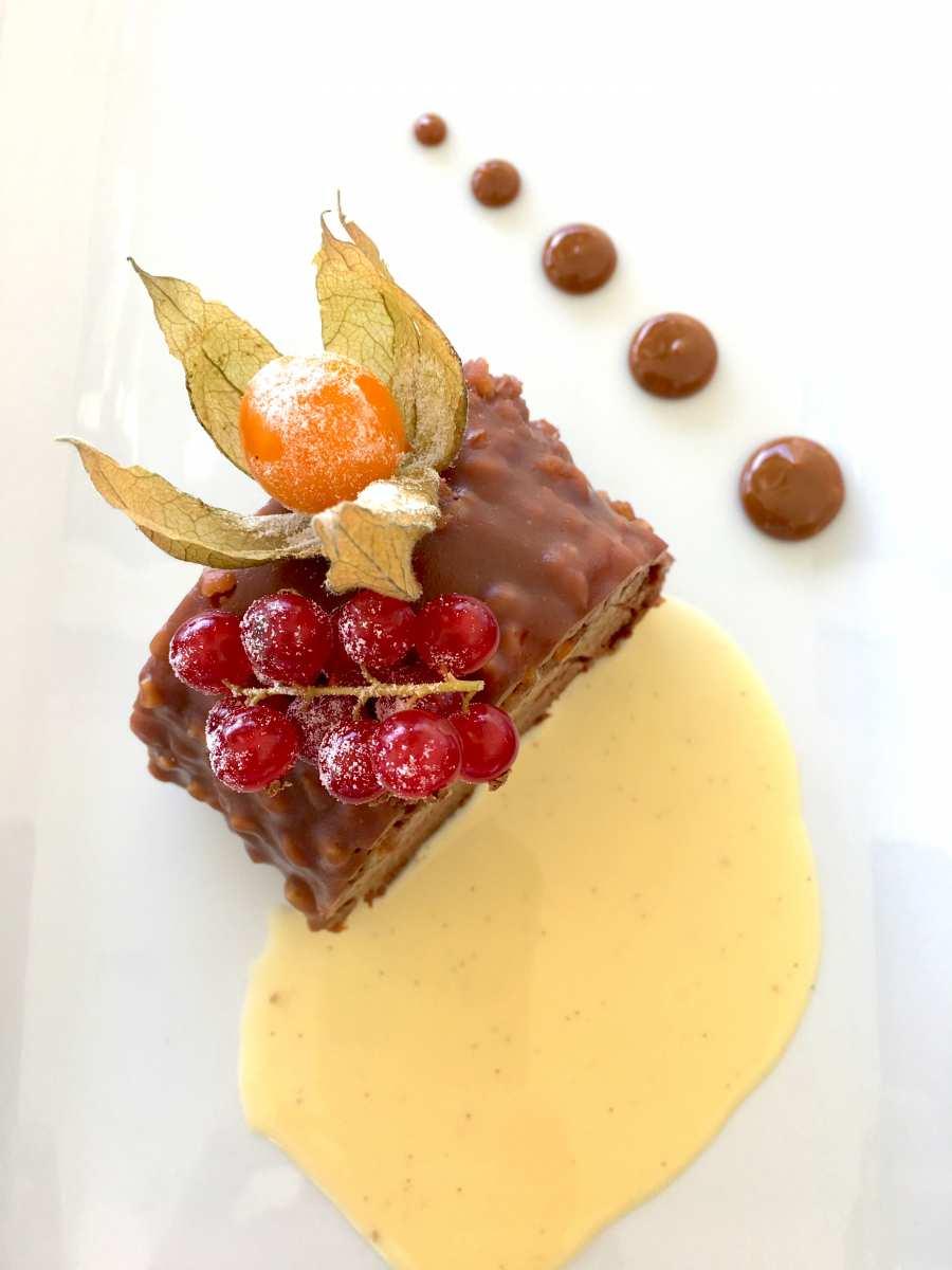 • Bavaroise μαύρης σοκολάτας με καραμελωμένο κροκάν αμυγδάλου σε τραγανή βάση