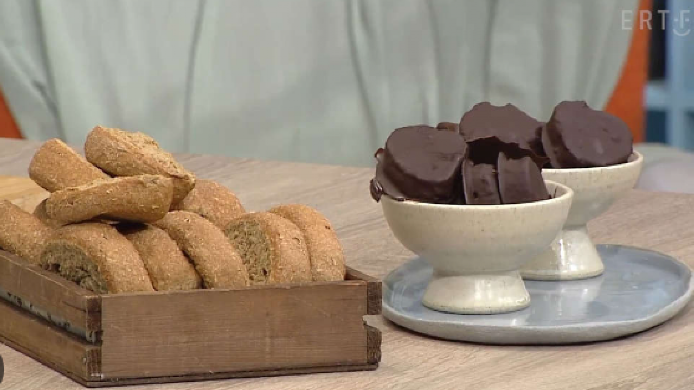 Αυτή τη φορά μας έδειξε πως μπορούμε να φτιάξουμε καριόκες με κρητικό παξιμάδι και γλυκό νερατζάκι.