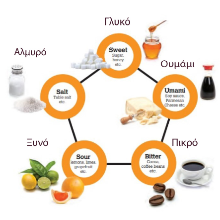 Αλμυρό, γλυκό, ξυνό, πικρό και ουμάμι.