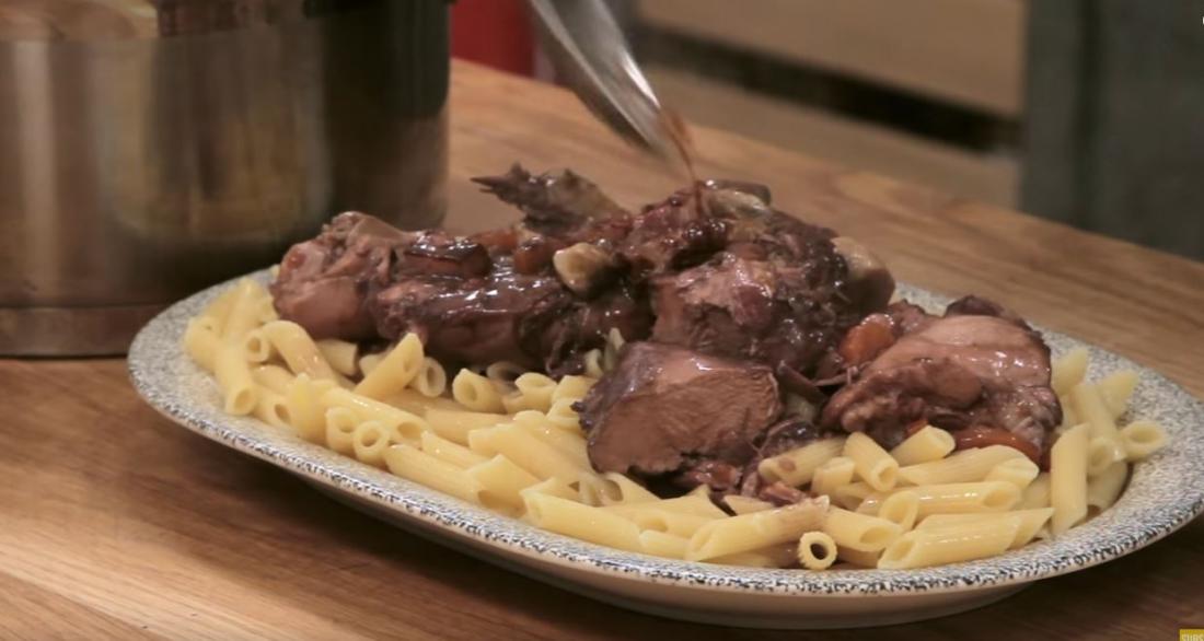 Σβήνουμε με το κονιάκ, προσθέτουμε το κρασί, χαμηλώνουμε τη φωτιά και ανακατεύουμε μέχρι να εξατμιστεί το αλκοόλ.