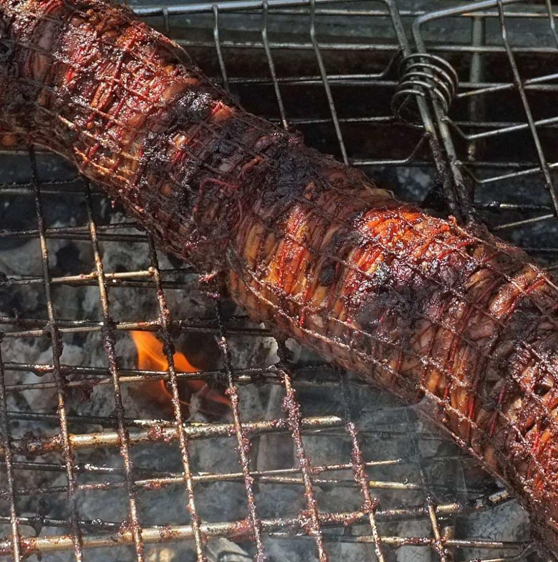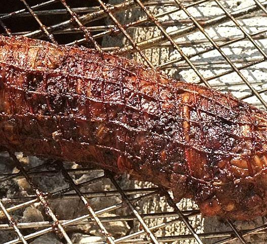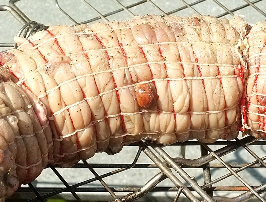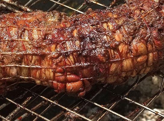 Ζύγιζε 3 κιλά όταν το πήρα. Αφού στράγγιξε καλά ολονυκτίς, ήτανε έτοιμο για ψήσιμο. Πριν το βάλω στην φωτιά το αλάτισα και πιπέρισα ελαφρά. Όταν η πρώτη ύλη είναι υψηλής ποιότητας, πρέπει να διαφυλαχθεί ως κόρη οφθαλμού η πραγματική γεύση και τα αρώματα της, χωρίς διαστρεβλώσεις.