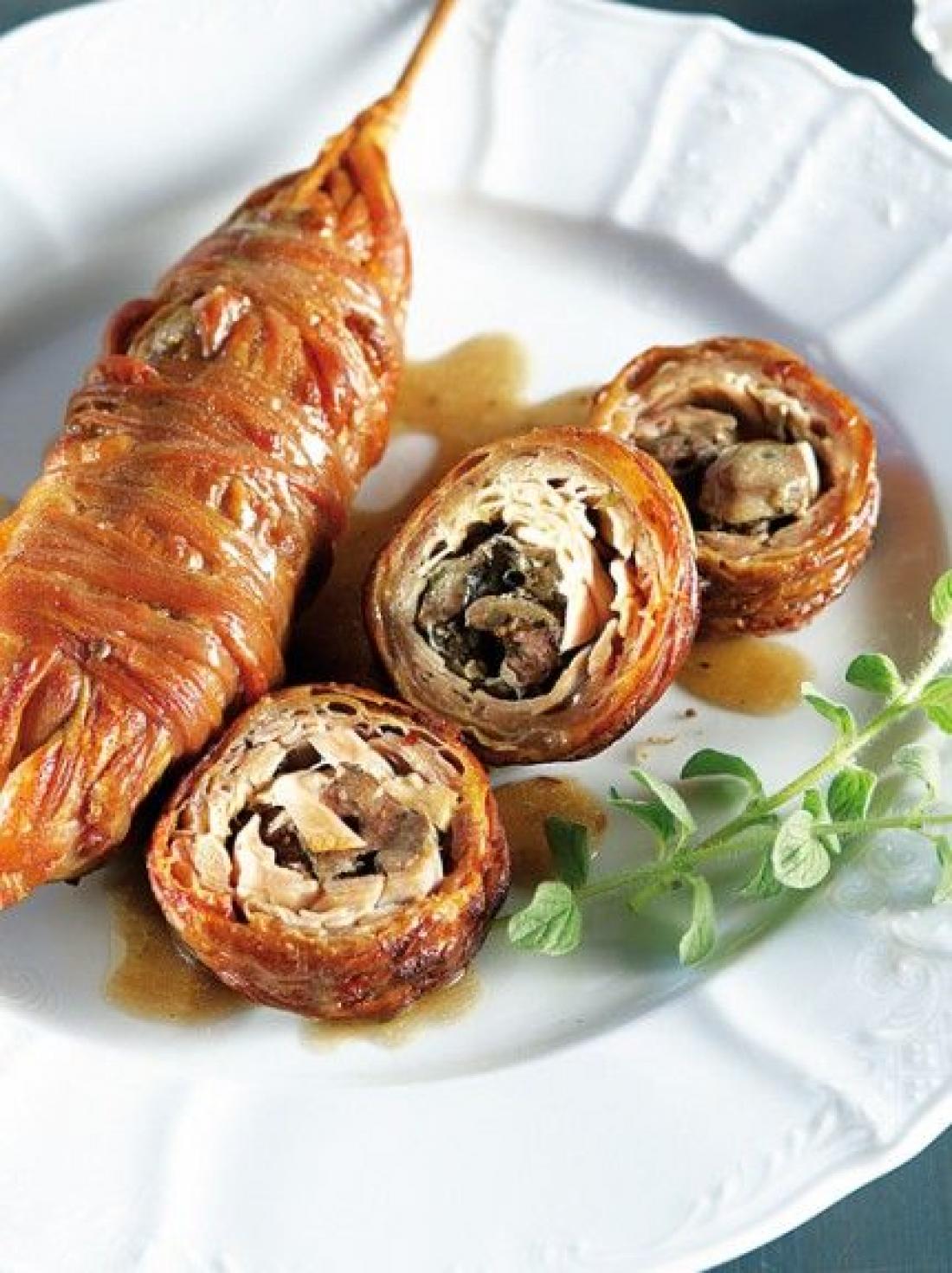 - Καθαρίζετε τις μπόλιες από τις τρίχες και τις ζεματάτε σε βραστό νερό. Βγάζετε τα χοντρά κομμάτια και αφήνετε τα κομμάτια που μοιάζουν με δίχτυ. Άσπρες και καθαρές, τις στρώνετε στον πάγκο της κουζίνας και τοποθετείτε από πάνω τα περασμένα σε καλαμάκι εντόσθια. Τα τυλίγετε σε ρολά μέσα σε κομμάτια μπόλιας.