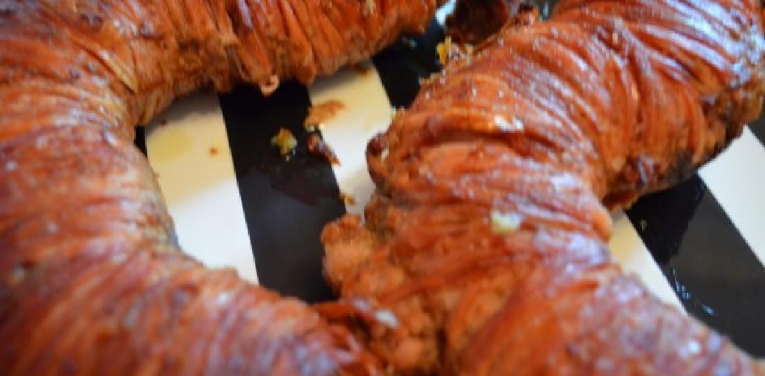 -Παίρνουμε και κόβουμε ένα κομμάτι μπόλιας ώστε να μας καλύψει όλη τη σούβλα και τυλίγουμε ομοιόμορφα από πάνω από το κρέας.