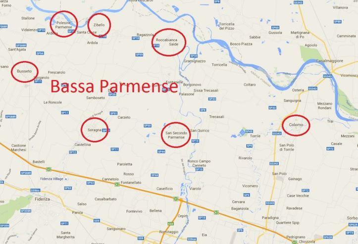 Πριν συνεχίσουμε, ας γνωρίσουμε την γενέθλια γη του κουλατέλλο, αυτό που οι Γάλλοι ονομάζουν τερουάρ (terroir). Ο χάρτης που βλέπετε στην εικόνα 3 έχει επτά κοινότητες σημειωμένες με κόκκινες ελλείψεις. Αυτές οριοθετούν την γη του κουλατέλλο, την Μπάσα Παρμένζε. Η μπλε γραμμή που κάνει ζιγκ-ζαγκ στο επάνω μέρος είναι ο ποταμός Πό, πηγή ζωής για ολόκληρη την περιοχή. Στο κάτω δεξιά μέρος, βρίσκεται η πόλη της Πάρμα (δεν φαίνεται).