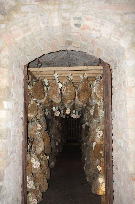 Πρώτη επίσκεψη στο κελάρι, να δούμε το θαυμαστό κουλατέλλο. Μια πέτρινη πόρτα και λίγα σκαλιά οδηγούν σε ένα ημι-υπόγειο. Το φώς είναι λιγοστό, μπαίνει από κάτι σχισμές στο επάνω μέρος , εκεί που αρχίζει το έδαφος. Από εκεί μπαίνει στο χώρο και η ομίχλη και μαζί της η υγρασία, που αποτελούν απαραίτητα στοιχεία για την ωρίμανση του κρέατος.
