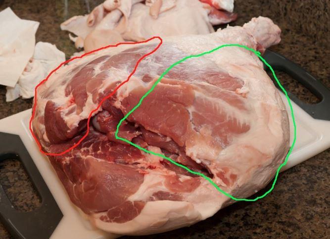 Το δεξί κομμάτι (πράσινο) θα γίνει κουλατέλλο, ενώ το αριστερό θα γίνει ένα αλλαντικό κατώτερης ποιότητας. Η φωτογραφία και η επεξήγηση είναι από το μπλογκ του Jason Molinari, "Cured Meats: The Art and the Craft". Ο τεμαχισμός του μπουτιού είναι ο λόγος για τον οποίο το κουλατέλλο είναι πολύ ακριβότερο από το προσιούτο.
