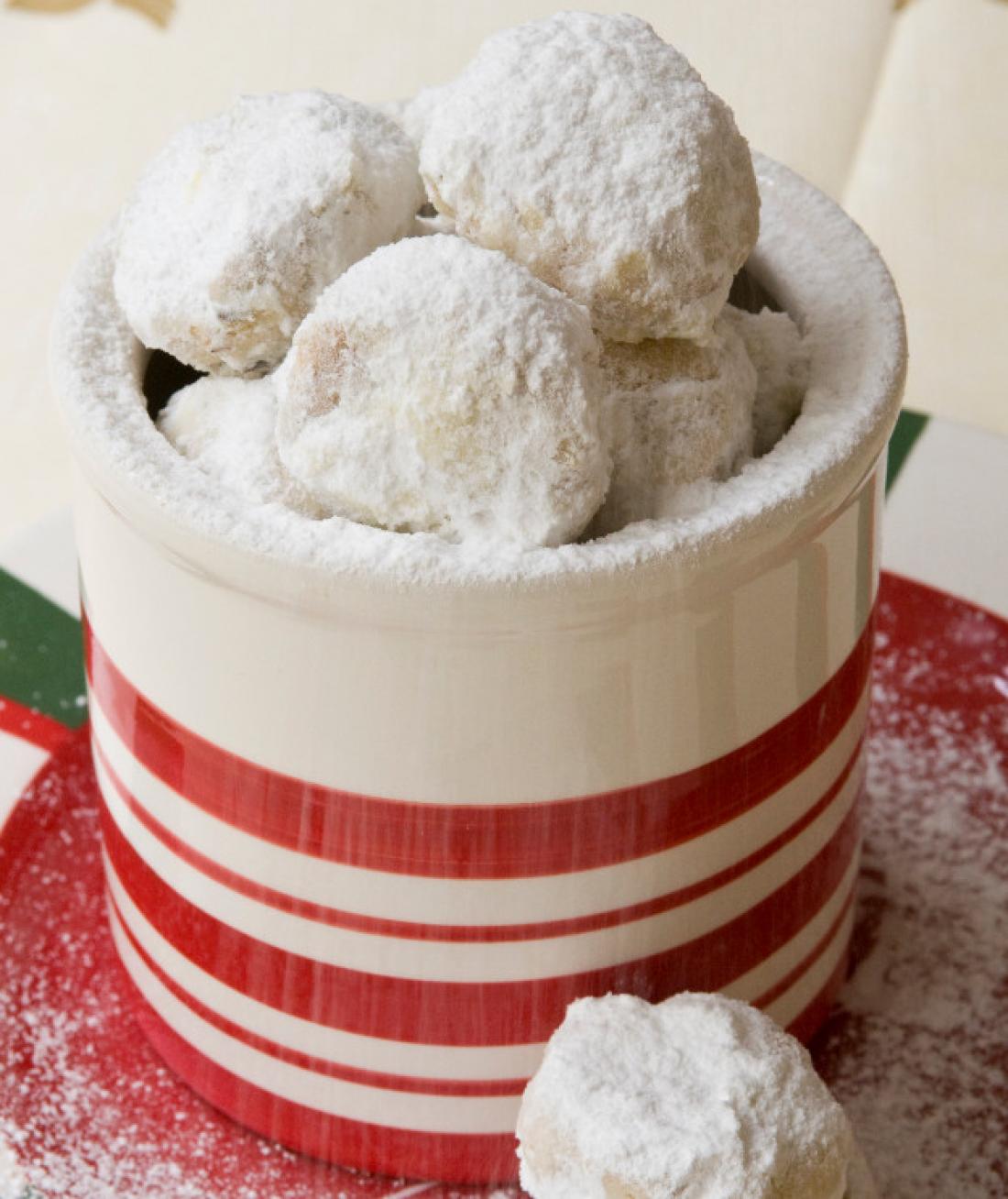 Βγάζουμε από το φούρνο, αφήνουμε να κρυώσουν πολύ καλά και τους ρίχνουμε σε ένα ταψί γεμάτο άχνη. Τους γυρνάμε να καλυφθούν καλά και τους μεταφέρουμε σε μία πιατέλα, όπου τους σερβίρουμε σε πυραμίδα, πασπαλίζοντας κάθε σειρά που βάζουμε με επιπλέον άχνη.