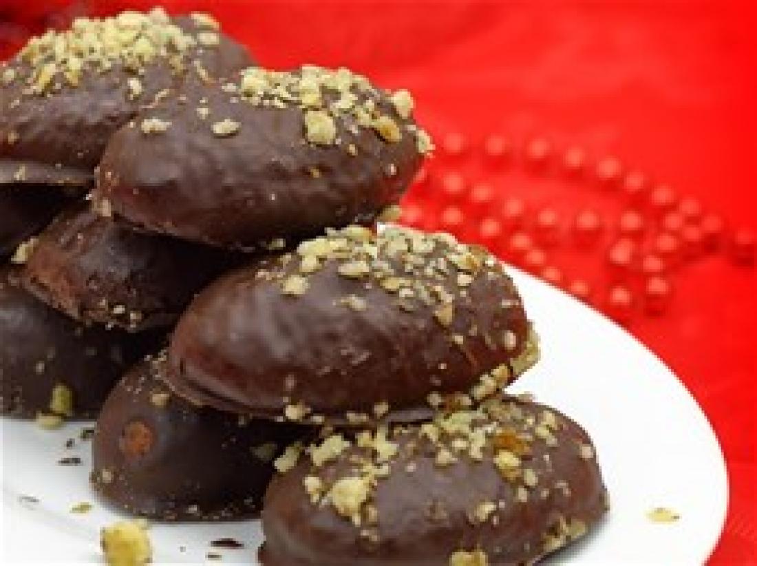 - Πασπαλίζουμε τα μελομακάρονα με το μείγμα καρυδιού και τα τοποθετούμε στο ψυγείο μέχρι να στερεοποιηθεί η σοκολάτα.
