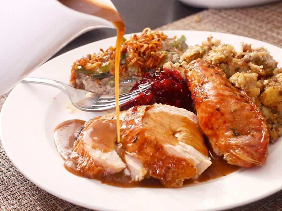 Στο κέντρο του τραπεζιού την Ημέρα των Ευχαριστιών δεσπόζει πάντα μια γεμιστή γαλοπούλα, η οποία χρειάζεται περίπου 2,5 ώρες για να γίνει και καταλαμβάνει το μεγαλύτερο χώρο του τραπεζιού. Η γέμισή της αποτελείται συνήθως από σέλινο, κρεμμύδι, πιπεριά, μανιτάρια, λαχανικά, κρουτόν, κεράσια, πεκάν, μαϊντανό, αβγά και μαύρο πιπέρι.