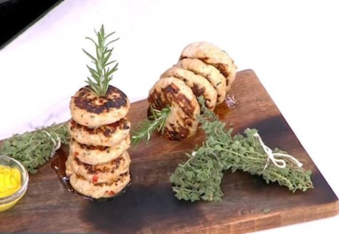 Ο Πέτρος Συρίγος ετοιμάζει μπιφτέκια γαλοπούλας.