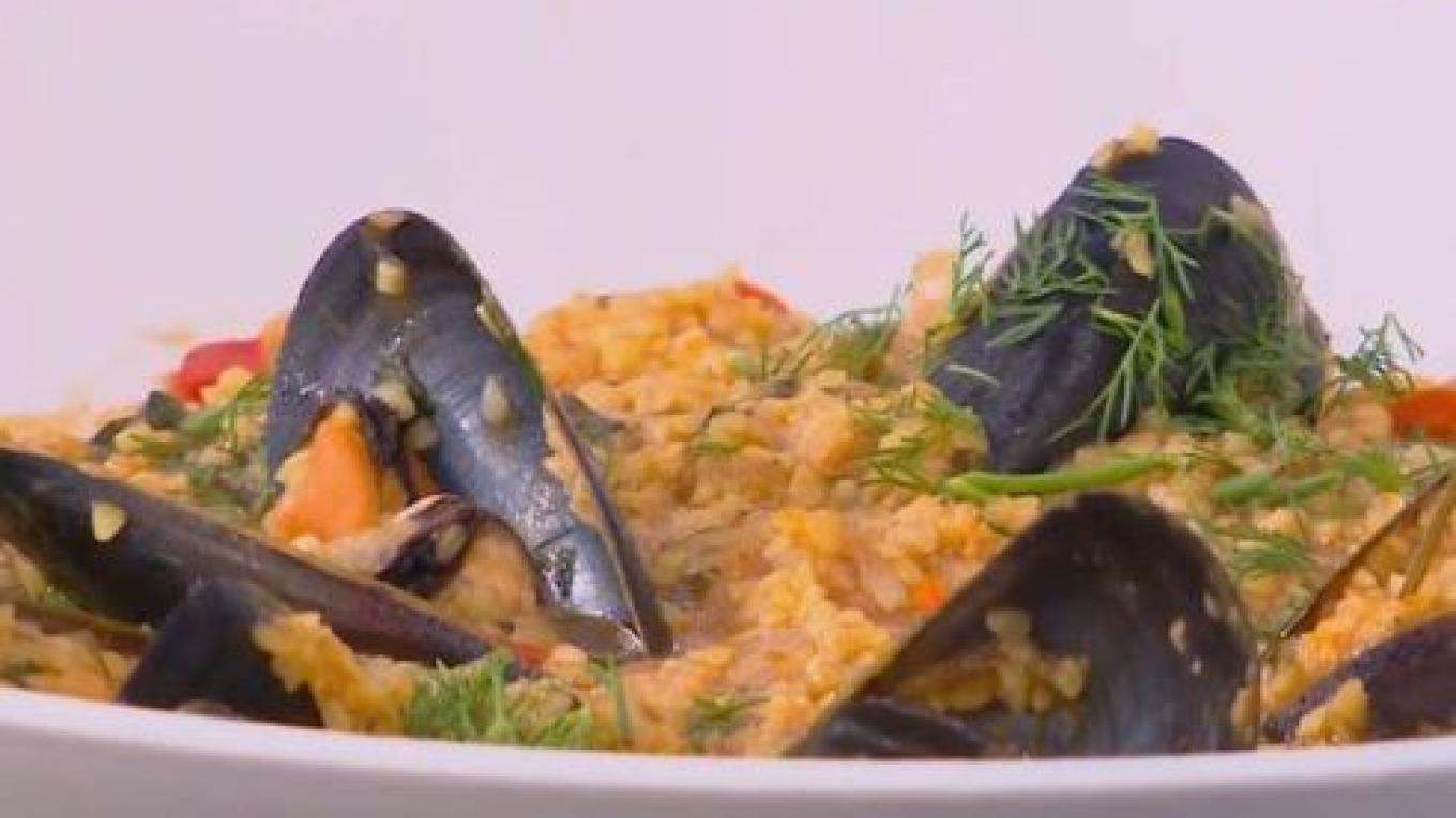 Mύδια κοκκινιστά με πλιγούρι και καπνιστές πιπεριές Φλώρινης