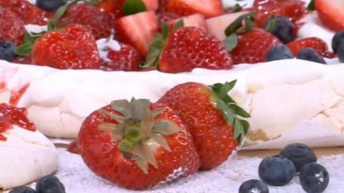 Για την επικάλυψη: 500 ml κρέμα γάλακτος 2-3 κ.σ. ζάχαρη 400 γρ. φράουλες 400 γρ. σμέουρα 200 γρ. μύρτιλα ζάχαρη άχνη