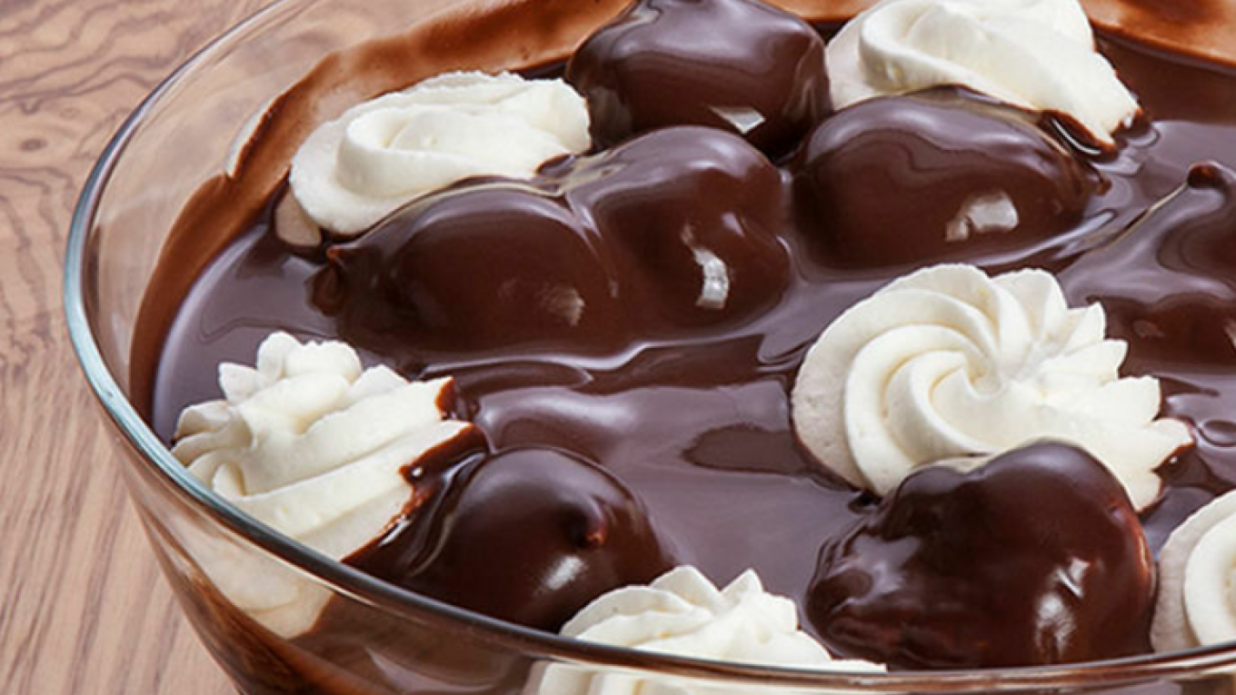 Προφιτερόλ εύκολο με σοκολάτα γάλακτος, σουδάκια και κρέμα πατισερί.