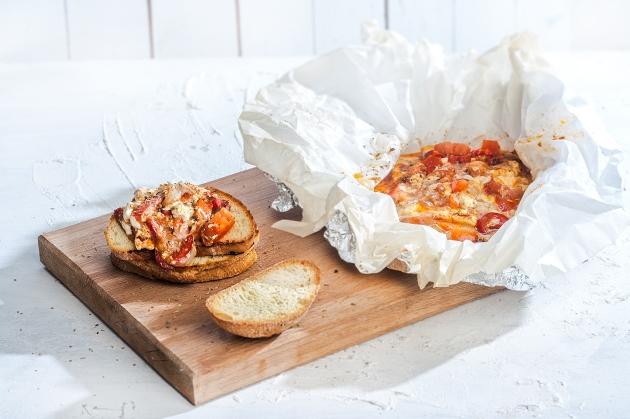 1 κομμάτι ανιτκολλητικό χαρτί ψησίματος 1κομμάτι αλουμινόχαρτο 1 κομμάτι φέτα (ολόκληρο κομμάτι) 150 γρ. κασέρι Ελασσόνας ( κομμένο σε φέτα, καρεδάκια ή τριμμένο) 2 ντομάτες ώριμες κόκκινες και σφιχτές 2 καυτερές φρέσκες πιπεριές ψιλοκομμένες 1 πιπεριά πιπεριά Φλωρίνης κομμένη σε μικρά κομμάτια 1/4 φλ. ελαιόλαδο 1 κ.σ. πάπρικα γλυκιά μπόλικη ρίγανη ψωμί φρυγανισμένο για το σερβίρισμα