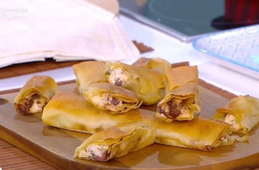 Εκτέλεση: Σε ένα ξύλο κοπής με ένα κοφτερό μαχαίρι κόβετε τις λιαστές τομάτες σε μικρά μπαστουνάκια και ψιλοκόβετε τα φρέσκα κρεμμυδάκια. Τοποθετείτε όλα τα υλικά σε ένα μεγάλο μπολ μαζί με την μυζήθρα και την φέτα, τριμμένες με τα χέρια σας, τα αυγά, το θυμάρι, αλάτι και φρεσκοτριμμένο πιπέρι και ανακατεύετε καλά. Απλώνετε τα χωριάτικα φύλλα σε ένα καθαρό πάγκο και τα κόβετε στην μέση κατά μήκος σε 2 κομμάτια. Απλώνετε μία λωρίδα γέμισης στο χωριάτικο φύλλο και το διπλώνετε σε σχήμα ρολού, κλείνοντας καλά τις άκρες. Τοποθετείτε τα ρολάκια χωριάτικο φύλο σε ένα παραλληλόγραμμο, αντικολλητικό ταψί, καλά λαδωμένο, τοποθετώντας το ένα ρολάκι δίπλα στο άλλο. Ψήνετε σε προθερμασμένο φούρνο στους 180ο C για περίπου 60 λεπτά.