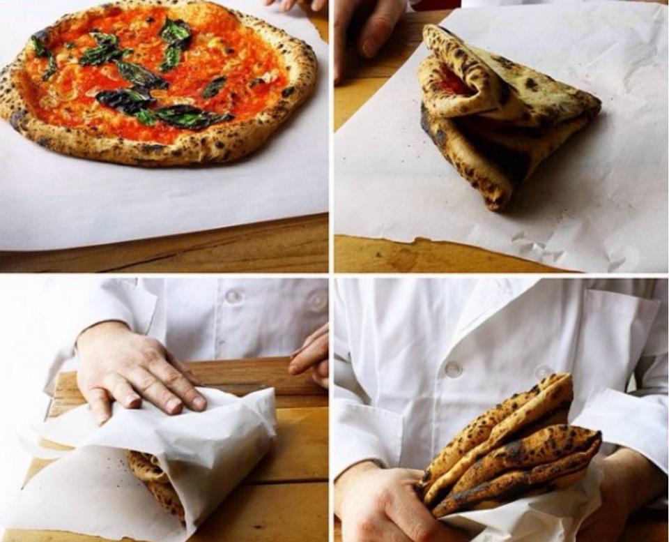 Ο βέλτιστος τρόπος να φάμε την πίτσα μας είναι να την διπλώσουμε σαν πορτοφόλι. Δίπλωσε την στα δύο και μετά φέρε τη μία άκρη στην άλλη. Αυτός είναι και ο τρόπος που σερβίρεται στους δρόμους της Νάπολη.