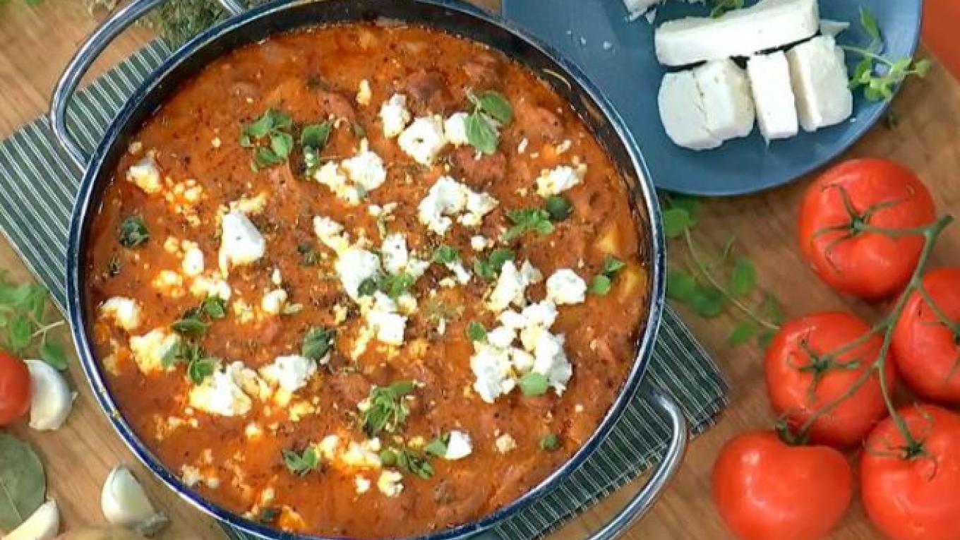 Σαγανάκι με λουκάνικο, πατάτες και ξυνομιζήθρα από τον Σταύρο Βαρθαλίτη!
