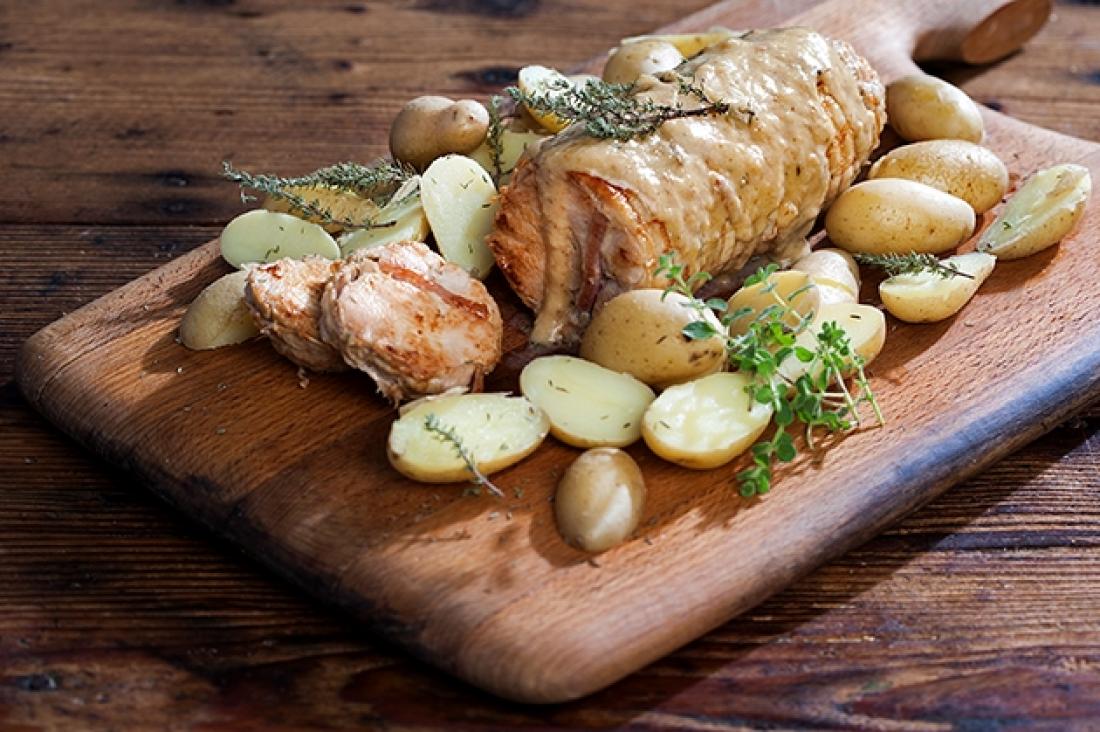 Κόβουμε σε φέτες το ρολό κοτόπουλο, γαρνίρουμε με τα βρασμένα πατατάκια κομμένα στη μέση, και περιχύνουμε με τη σάλτσα μουστάρδας.