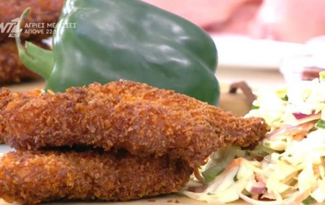 Ο Πέτρος Συρίγος ετοιμάζει σνίτσελ κοτόπουλο σε κρούστα παρμεζάνας.