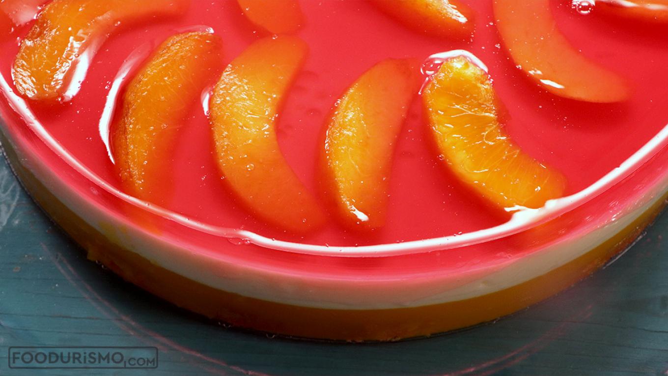 Αφού αδειάσετε και το ζελέ, αραδιάζετε και τις φέτες των φρούτων και βάζετε το γλυκό στο ψυγείο για τουλάχιστον 4-5 ώρες.