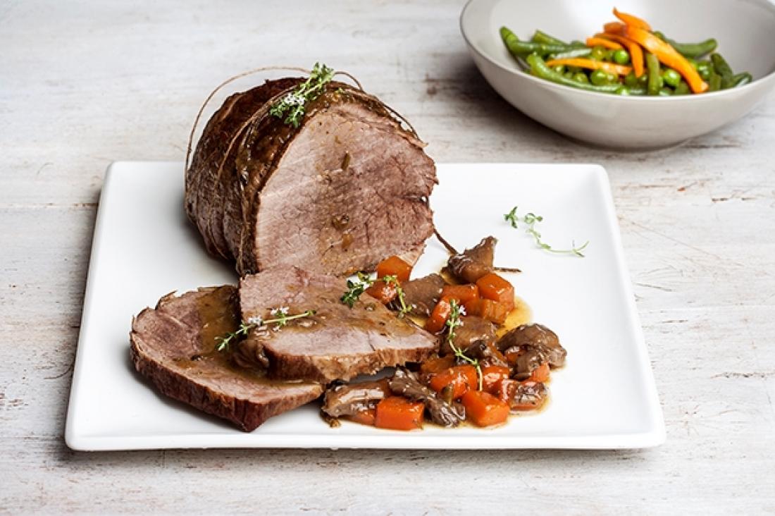 Ταμπονάρουμε το νουά με απορροφητικό χαρτί να στεγνώσει. Το δένουμε με σπάγκο ψησίματος για να κρατήσει το σχήμα του κατά το μαγείρεμα. Το αφήνουμε για 40′ να έρθει σε θερμοκρασία δωματίου.