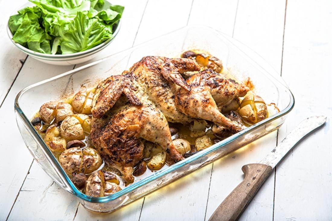 Τοποθετούμε το κοτόπουλο με το στήθος προς τα κάτω στον πάγκο. Με ψαλίδι κουζίνας ή κοφτερό μαχαίρι κόβουμε κατά μήκος τη μία πλευρά, από την ουρά προς το λαιμό. Πιέζουμε και ανοίγουμε διάπλατα (πεταλούδα) το κοτόπουλο. Αναποδογυρίζουμε το κοτόπουλο, με το στήθος προς τα εμάς και την κοιλιά του στον πάγκο. Πατάμε με τα χέρια γερά, να γίνει όσο πιο πλακέ γίνεται. Πιέζοντάς το, σπάει το κόκαλο του στήθους και πλαταίνει. Αλατοπιπερώνουμε το κοτόπουλο και από τις δύο πλευρές.