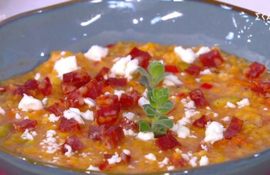 Τραχανάς κοκκινιστός με chorizo και φέτα