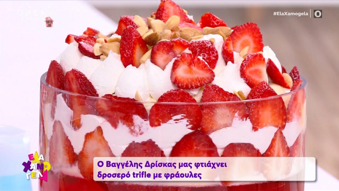Δείτε τώρα τον Βαγγέλη Δρίσκα πως θα φτιάξει εύκολα και γρήγορα το trifle με φράουλες: