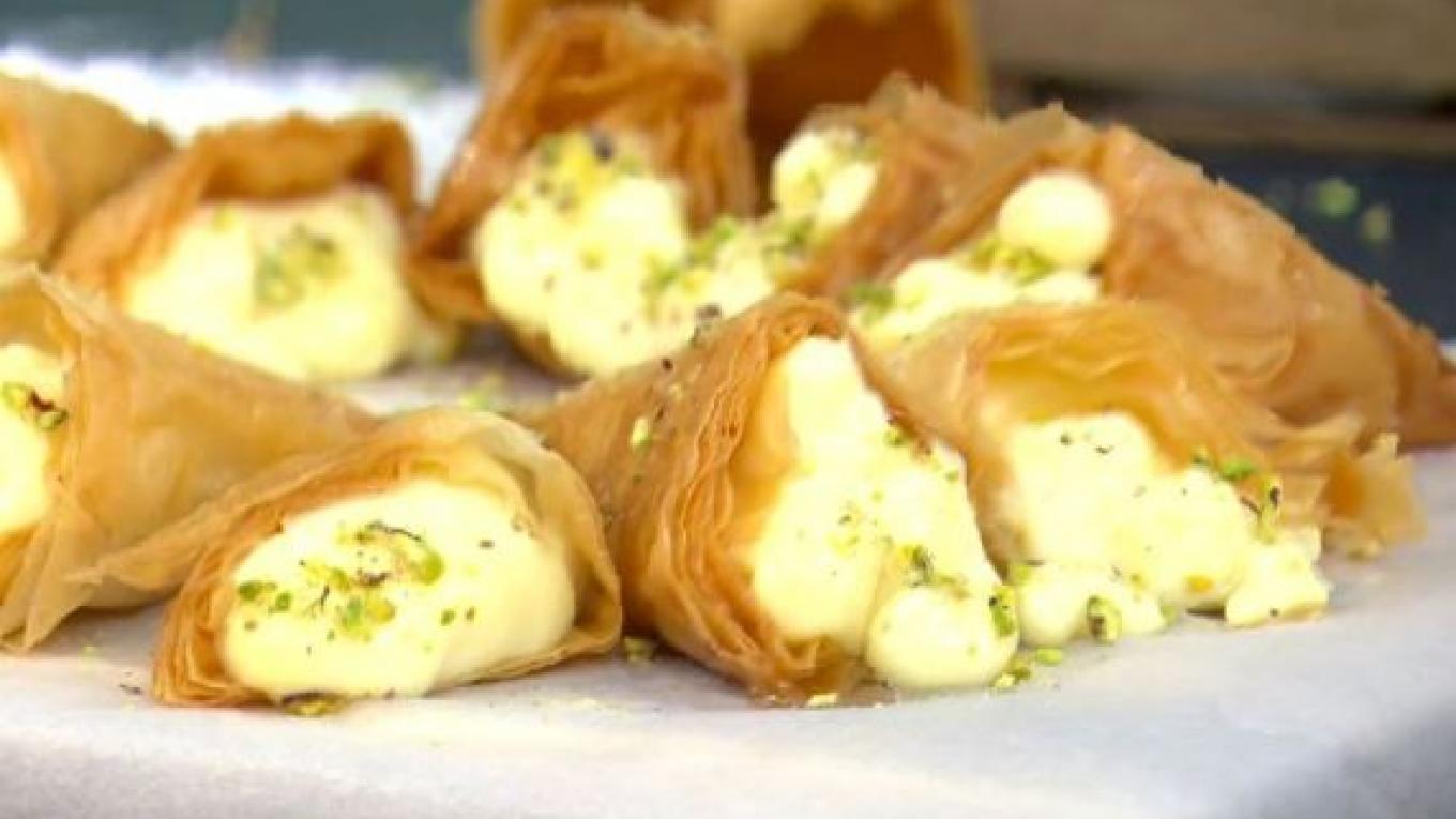 Υλικά για τα τρίγωνα: 500 γρ. φύλλο κρούστας, 200 γρ. βούτυρο. Υλικά για τη γέμιση: 1 λίτρο φρέσκο γάλα 3,5%, 200 γρ. κρυσταλλική ζάχαρη, 80 γρ. κόρν φλάουρ, 3 κρόκοι αυγών, 2 κ.σ. βούτυρο, 1 κ.γ. μαστίχα σε σκόνη, 2 βανίλιες σε σκόνη.