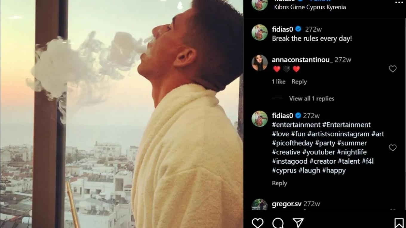 Η επίμαχη φωτογραφία που αναρτήθηκε σαν story στο Instagram, δείχνει τον Φειδία Παναγιώτου να φωτογραφίζεται σε ξενοδοχείο της κατεχόμενης Κερύνειας, φορώντας μπουρνούζι και καπνίζοντας ναργιλέ, ενώ ήταν ακόμα μέλος της Εθνικής Φρουράς. Στους Ελληνοκύπριους στρατιώτες απαγορεύεται κάθε παράνομη “επίσκεψη” στα κατεχόμενα.