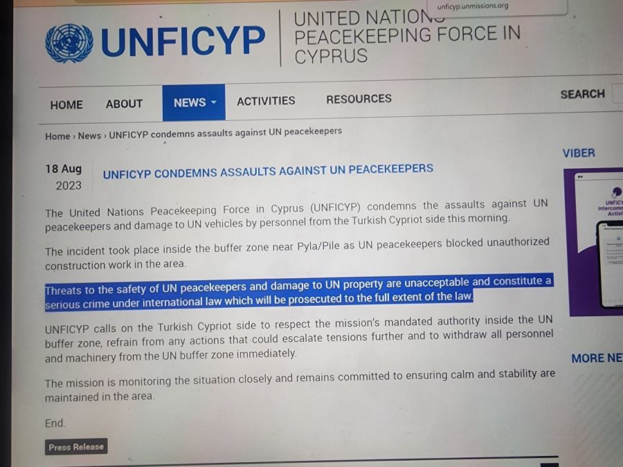 Η ανακοίνωση της ΟΥΝΦΙΚΥΠ είναι απειλητική για τις τουρκικές κατοχικές αρχές, που δημιούργησαν τα σοβαρότατα επεισόδια εναντίον των μελών της Δύναμης.