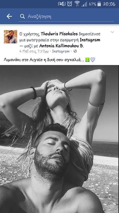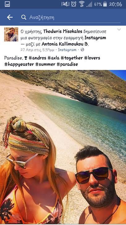 O Θοδωρής Μισόκαλος ανήρτησε στον προσωπικό του λογαριασμό στο facebook φωτογραφικό υλικό με την Αντωνία στο ταξίδι τους στην Άνδρο και συγκεκριμένα στην παραλία Άχλα , που είναι φαν της και το ζευγάρι Μενεγάκη-Παντζόπουλος. Ο Θοδωρής φαίνεται να καμαρώνει για το κορίτσι του και οι δυό τους είναι ερωτευμένοι.