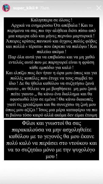 «Καλησπέρα σε όλους. Αρχικά να ενημερώσω ότι απέβαλα! Και το περίμενα να σας πω την αλήθεια διότι πίσω από μια κάμερα εδώ και μήνες περνάω μαρτυρικά. Άπειρες κρίσεις πανικού και άγχους, πολύς φόβος και πολλά τέρατα που έπρεπε να παλέψω. Και παλεύω ακόμα. Παρ’ όλα αυτά για να μπορέσω να επιβιώσω και να μη χαθώ εντελώς, αυτό που με παρηγορεί είναι η φράση “κάθε εμπόδιο για καλό”.