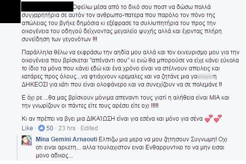 Για άλλη μια φορά η Μίνα Αρναούτη σχολίασε μια ανάρτηση που συνέκρινε το τροχαίο δυστύχημα του Παντελή Παντελίδη και το τροχαίο με την Πόρσε στην Αθηνών - Λαμίας.