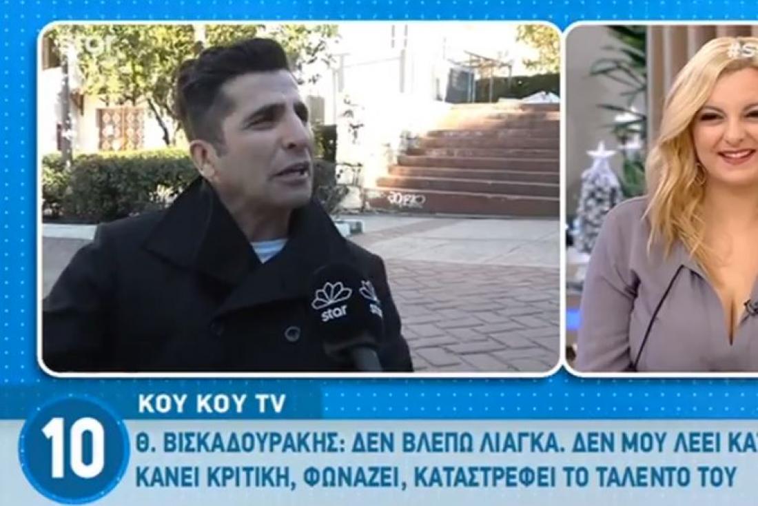 «Τι να δω; Δεν μου λέει τίποτα. Ένας που τα ξέρει όλα, κάνει κριτική, φωνάζει. Ενώ έχει ταλέντο. Βλέπω ότι έχει μία μόρφωση, κάνει το αντίθετο για να καταστρέψει το ταλέντο του. Να μιλούσαμε σαν άντρες θα του έλεγα: Γιατί καταστρέφεις το ταλέντο σου; Να ασχολείσαι με το κίτρινο; Να καλείς ανθρώπους που δεν έχουν θέση στην τηλεόραση », είπε ο ηθοποιός.