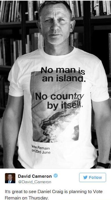 O τελευταίος «Τζέιμς Μποντ», κατά κόσμον Ντάνιελ Κρεγκ, ανακοίνωσε τι θα ψηφίσει στο δημοψήφισμα της Πέμπτης με ένα t-shirt. «Κανείς δεν είναι νησί. Καμία χώρα δεν μπορεί να μένει μόνη της. Ψηφίστε remain στις 23 Ιουνίου» έγραφε η στάμπα στο κοντομάνικο του Ντάνιελ Κρεγκ, ο οποίος έτσι ξεκαθάρισε τη θέση του για παραμονή.