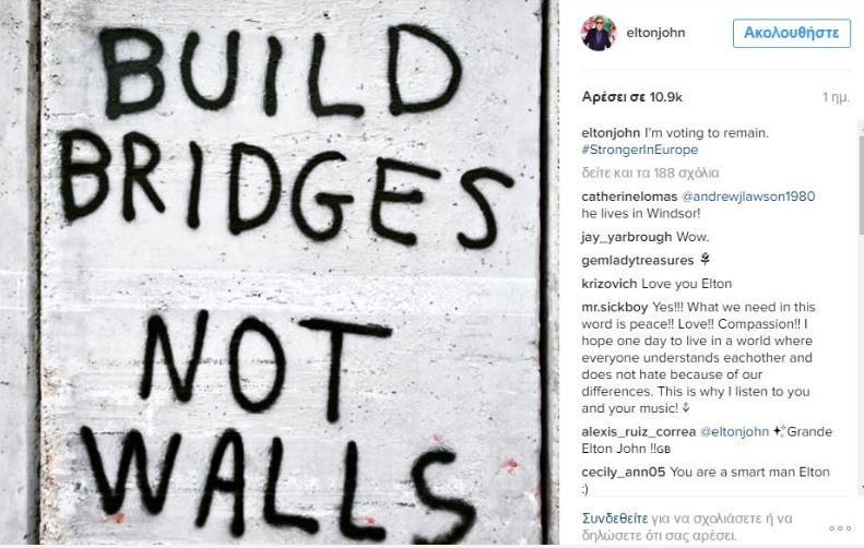 Στον λογαριασμό του στο Instagram, ο Έλτον Τζον ανέβασε μια φωτογραφία του συνθήματος «Χτίστε γέφυρες, όχι τείχη» και δήλωσε απερίφραστα ότι θα ψηφίσει υπέρ της παραμονής της Βρετανίας στην ΕΕ.