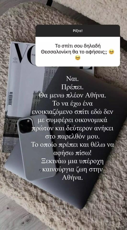 Μάλιστα, η Βρισηίδα Ανδριώτου ετοιμάζεται από το Φθινόπωρο να κάνει μεγάλες αλλαγές στη ζωή της. Συγκεκριμένα, όπως αποκάλυψε μέσα από τον προσωπικό της λογαριασμό στο Instagram θα μετακομίσει από τη Θεσσαλονίκη στην Αθήνα.