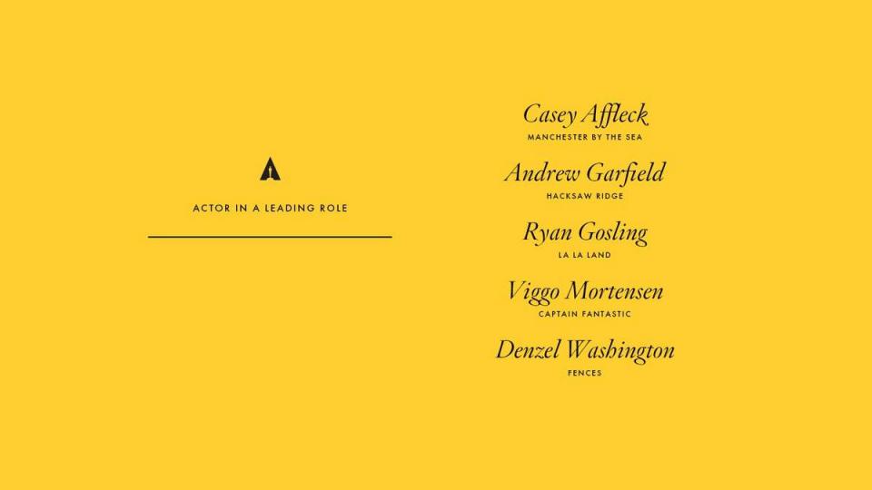 Υποψήφιοι για το Όσκαρ πρώτου ανδρικού ρόλου είναι οι Κέισι Άφλεκ, Άντριου Γκάρφιλντ, Ράιαν Γκόσλινγκ, Βίγκο Μόρτενσεν και Ντάνζελ Ουάσινγκτον.