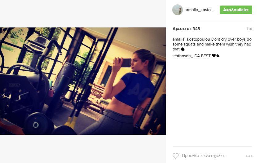 Η Αμαλία Κωστοπούλου, η όμορφη κόρη της Τζένης Μπαλατσινού και του Πέτρου Κωστόπουλου, ξέρει τι θέλουν οι άνδρες. Το όμορφο μοντέλο φροντίζει να γυμνάζει καθημερινά το σώμα της και ανέβασε μια σέξι φωτογραφία της, από το γυμναστήριο, στον λογαριασμό της στο Instagram.