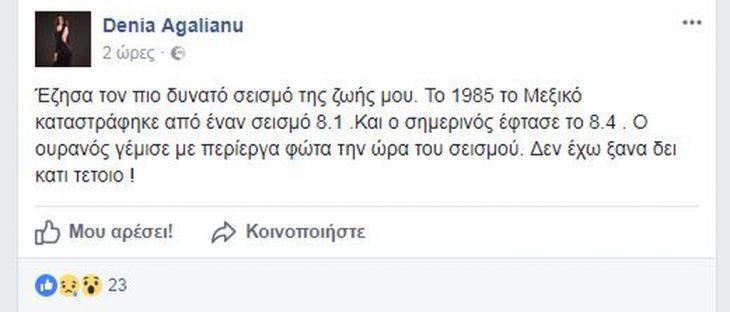 «Έζησα τον πιο δυνατό σεισμό της ζωής μου. Το 1985 το Μεξικό καταστράφηκε από έναν σεισμό 8.1 .Και ο σημερινός έφτασε το 8.4 . Ο ουρανός γέμισε με περίεργα φώτα την ώρα του σεισμού. Δεν έχω ξανά δει κάτι τέτοιο» έγραψε χαρακτηριστικά το πανέμορφο μοντέλο που σώθηκε από καθαρή τύχη.