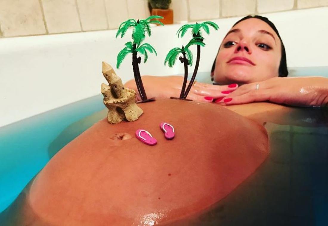 Η μέλλουσα μαμά, στόλισε την κοιλίτσα της με φοίνικες , σαγιονάρες, ένα μικρό κάστρο και κάλυψε το στήθος της με τα χέρια για να τη φωτογραφίσει ο αρραβωνιαστικός της.