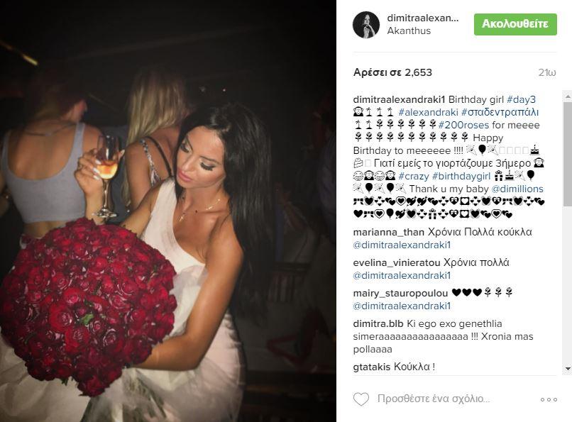Σαμπάνιες, Ακριβές τούρτες γενεθλίων, μάρκες από δω και από κεί, άπειρα δώρα αγάπης, 200 τριαντάφυλλα και ξέφρενο πάρτι σε clubs. Η Δήμητρα, που έκλεισε τα 26 της χρόνια, ξέρει πώς να διασκεδάζει και παραδίδει μαθήματα για το πώς να γιορτάσεις τα γενέθλια σου την επόμενη φορά.