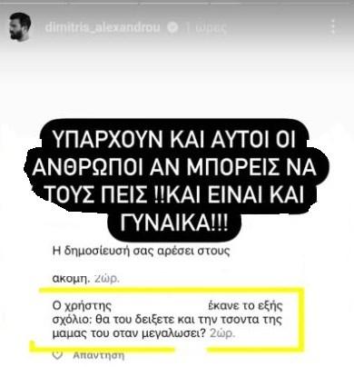 Όπως ήταν επόμενο το σχόλιο αυτό ενόχλησε τον Δημήτρη Αλεξάνδρου ο οποίος σε Instagram story του έγραψε: «Υπάρχουν και αυτοί οι άνθρωπο αν μπορείς να τους πεις. Και είναι και γυναίκα».