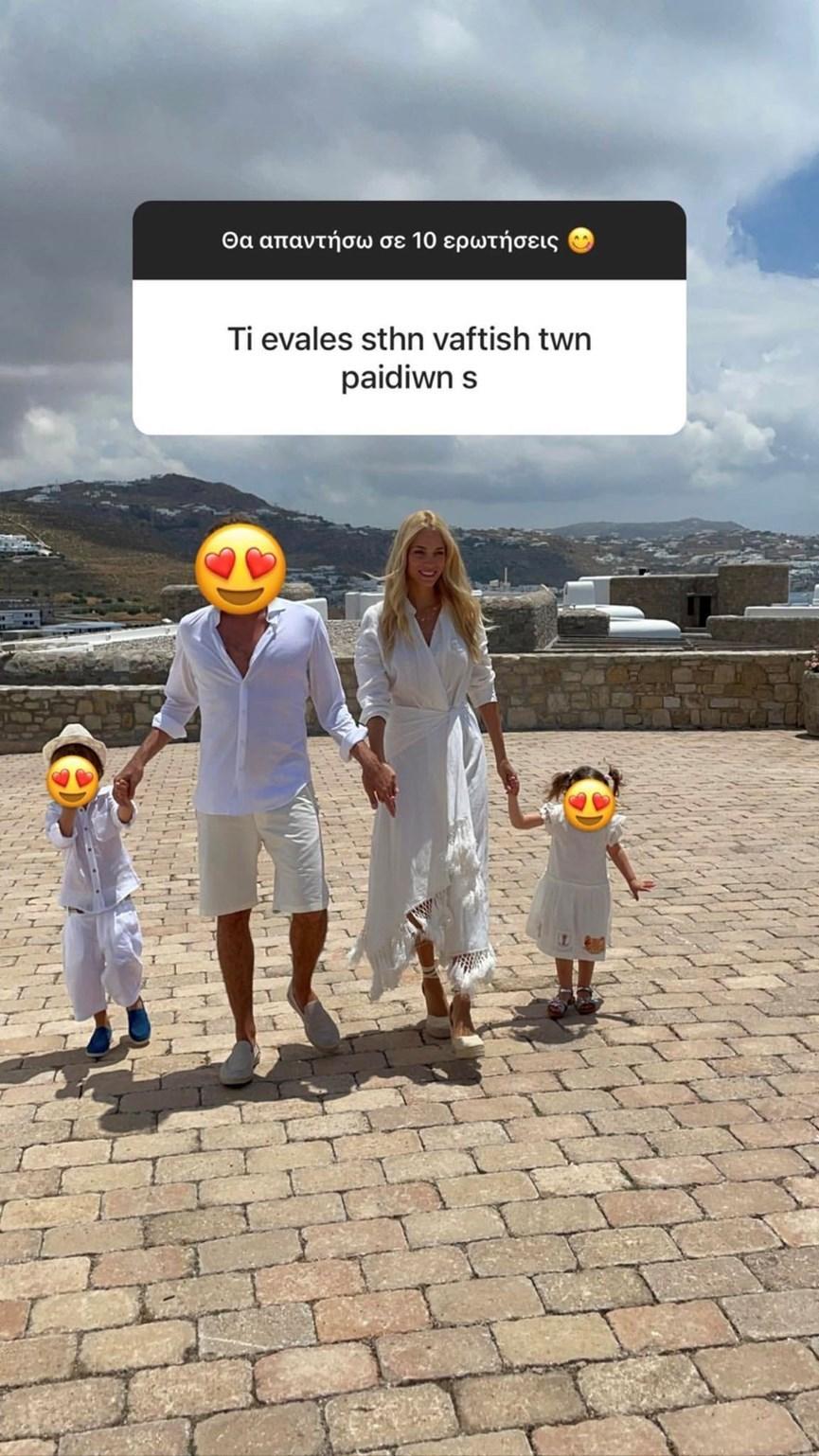 Μάλιστα, πρόσφατα πραγματοποίησε ένα Q&A και απάντησε σε διάφορες απορίες των followers της. Μια από τις ερωτήσεις που δέχτηκε ήταν τι φόρεσε στη βάφτιση των παιδιών της που πραγματοποιήθηκε το καλοκαίρι στη Μύκονο.